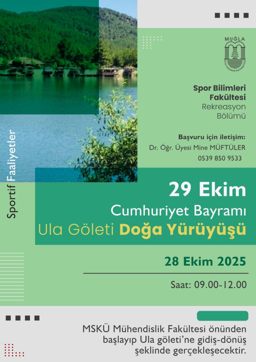 29 Ekim Cumhuriyet Bayramı Ula Göleti Doğa Yürüyüşü Son Güncelleme : 24.10.2025 15:24:04 Basın, Halkla İlişkiler ve Protokol Müdürlüğü Tarih : 17.10.2025 08:30