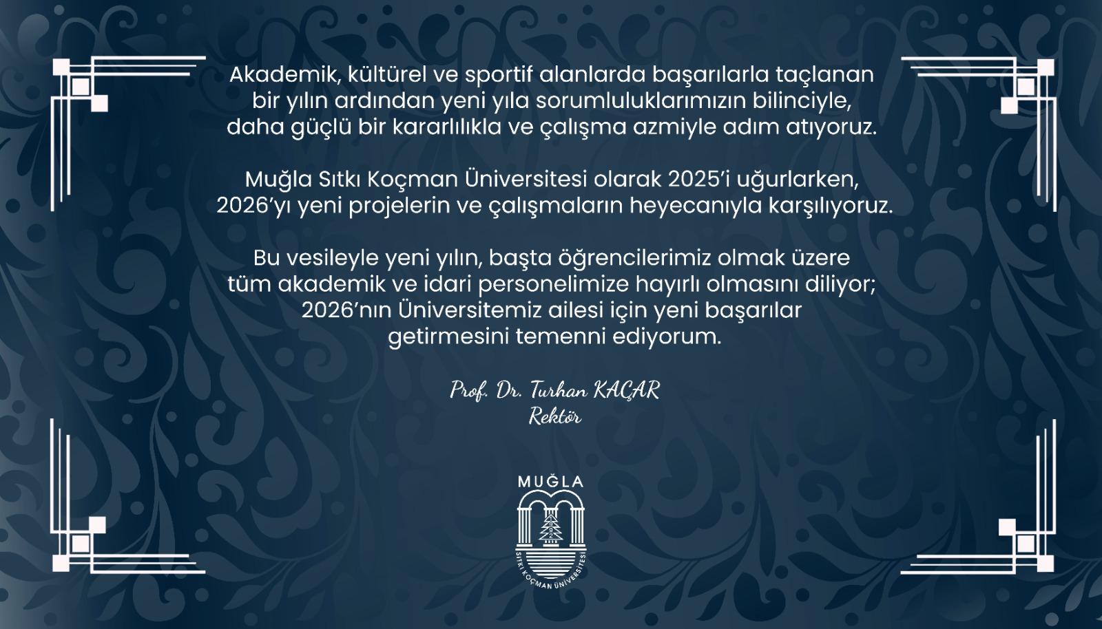 Rektörümüz Prof. Dr. Turhan Kaçar'ın Yeni Yıl Mesajı Son Güncelleme : 30.12.2025 11:34:08 Yayınlayan : basin.mu.edu.tr Tarih : 30.12.2025 00:00 Okunma Sayısı : 48