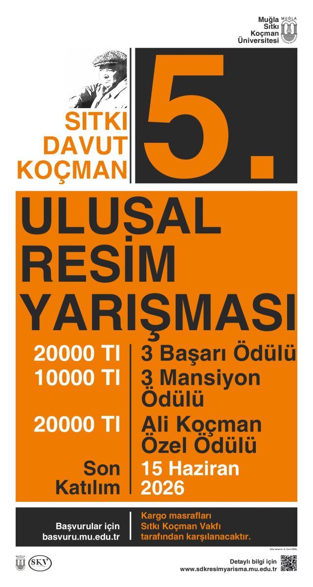 Sıtkı Davut Koçman 5. Ulusal Resim Yarışması Başladı Son Güncelleme : 20.02.2026 14:11:48 Sıtkı Koçman Vakfı ve Muğla Sıtkı Koçman Üniversitesi destekleriyle düzenlenen Sıtkı Davut Koçman 5. Ulusal Resim Yarışması eser kabulü 10 Mart 2026 tarihinde başlayacaktır. Yarışmaya Türkiye’deki üniversitelerin güzel sanatlar, sanat ve tasarım ya da güzel sanatlar eğitimi alanlarında lisans ve lisansüstü öğrenim görmekte olan öğrencilere ait çalışmalar kabul edilmektedir. Dijital ortamda eser gönderimi 15 Haziran 2026 tarihine kadar başvuru.mu.edu.tr adresi üzerinden yapılacaktır. İlk aşamda çalışmalar dijital ortamda değerlendirilerek 2. aşamaya geçecek çalışmalar belirlenecektir. İkinci aşama için çalışmaların orijinalleri 2 Temmuz 2026 tarihine kadar kabul edilecek olup KARGO GÖNDERİM ÜCRETLERİ SITKI KOÇMAN VAKFI TARAFINDAN KARŞILANACAKTIR. Çalışmaların PTT KARGO İLE GÖNDERİLMESİ GEREKMEKTEDİR. Ayrıntılı bilgi yarışma resmi sitesi olan sdkresimyarisma.mu.edu.tr adresinde bulunmaktadır. Yayınlayan : sdkresimyarisma.mu.edu.tr Tarih : 12.02.2026 00:00 Okunma Sayısı : 52