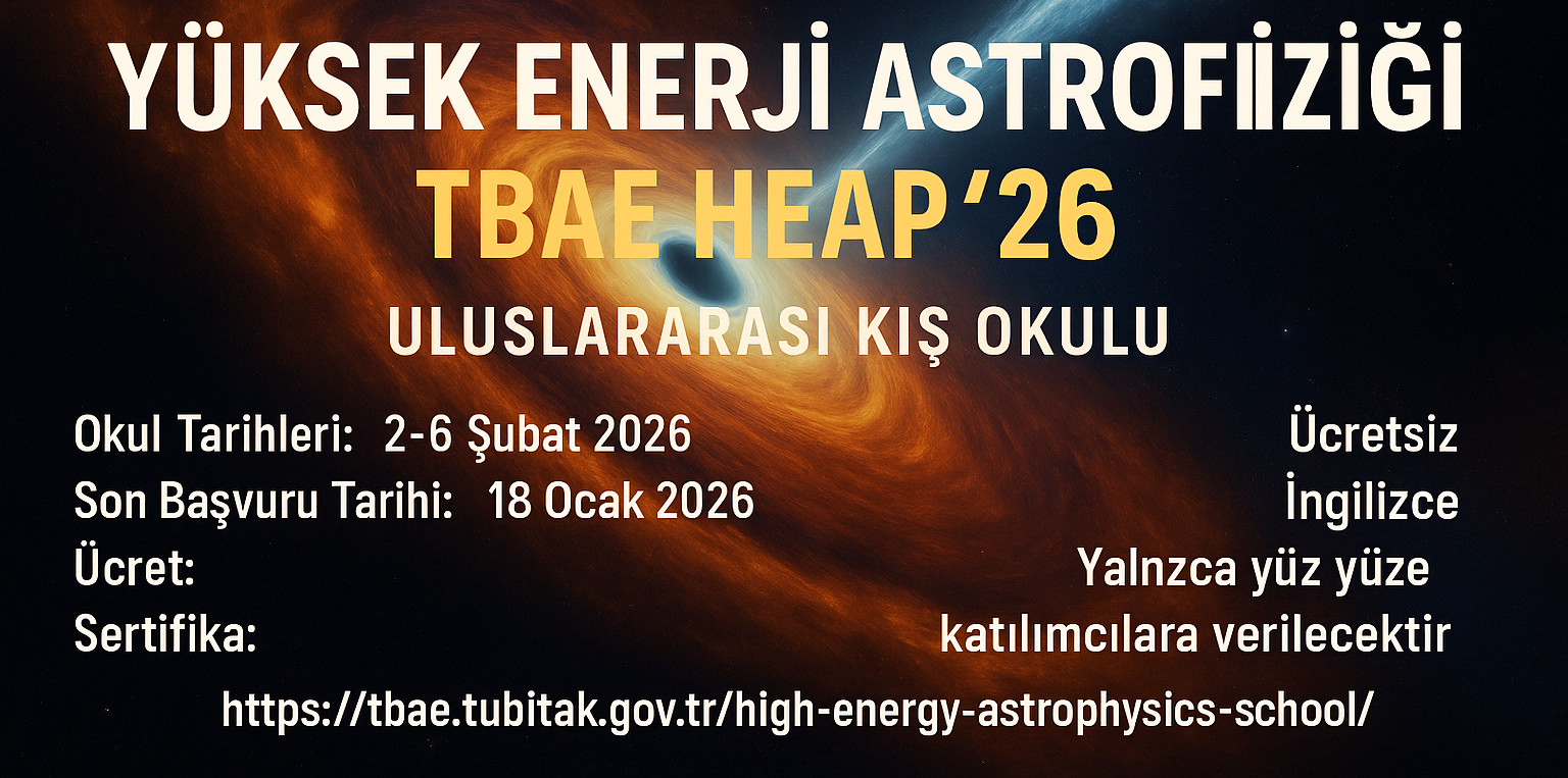 TÜBİTAK TBAE High Energy Astrophysics (HEAP'26) Uluslararası Kış Okulu Duyurusu Son Güncelleme : 04.12.2025 10:08 Sayın Yetkili, TÜBİTAK Temel Bilimler Araştırma Enstitüsü (TBAE), temel bilimin çeşitli dallarında ve disiplinler arası alanlarda oldukça geniş bir yelpazede nitelikli bilgi üretmek, uluslararası düzeyde bilimsel etkinlikler gerçekleştirmek ve Türkiye’ye bilimsel rekabet gücü kazandırmak yönündeki çabalarını arttırmaya yönelik 2–6 Şubat 2026 tarihleri arasında "Yüksek Enerji Astrofiziği (TBAE HEAP'26)" uluslararası kış okulu etkinliği düzenleyecektir. Bu kış okulu, yüksek enerji astrofiziği alanına ilgi duyan lisans/lisansüstü öğrenciler ve kariyerinin başındaki araştırmacılar için sağlam bir teorik altyapı ve deneysel bakış açısı sağlamayı amaçlamaktadır. Program kapsamında, kompakt astrofiziksel cisimler, yüksek enerji astrofiziğinde ışıma süreçleri, kozmik ışınlar ve parçacık ivmelenmesi, kütleçekim dalgaları ve nötrino astronomisi, gözlemsel teknikler ve veri analizi, teleskop ve dedektör teknolojileri, çok dalga boylu ve çok habercili astronomi konuları ele alınacaktır. Yüz yüze katılım kontenjanı 50 kişi ile sınırlıdır. İlgili alanlardaki yüksek lisans, doktora yapan, ve doktora sonrası araştırmacılara yüz yüze katılım için öncelik verilecektir. Seçilen tüm katılımcılara ücretsiz konaklama ve Türkiye içi (otobüs/tren) ulaşım desteği sağlanacaktır. Zoom üzerinden çevrim içi katılım herkese açıktır ve herhangi bir ön koşul bulunmamaktadır. Okul Tarihleri : 2-6 Şubat 2026 Son Başvuru Tarihi : 18 Ocak 2026 Ücret : Ücretsiz Ders Dili : İngilizce Sertifika : Yalnızca yüz yüze katılımcılara verilecektir Tüm detaylara ve başvuru formuna resmi web sitesinden ulaşabilirsiniz: https://tbae.tubitak.gov.tr/high-energy-astrophysics-school/ Yayınlayan : bap.mu.edu.tr Tarih : 04.12.2025 9:54 Okunma Sayısı : 54