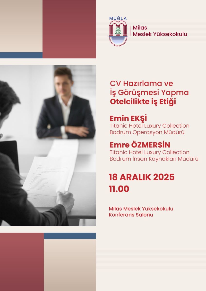 CV Hazırlama ve İş Görüşmesi Yapma Otelcilikte İş Etiği Son Güncelleme : 15.12.2025 11:42:07 Basın, Halkla İlişkiler ve Protokol Müdürlüğü Tarih : 15.12.2025 08:30